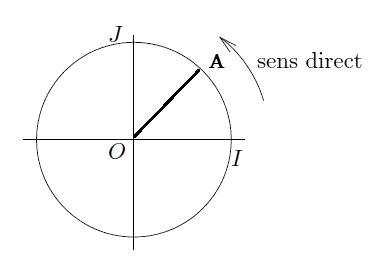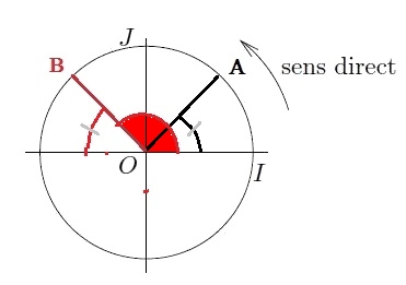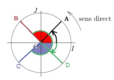 De même $\widehat{IOB}=\widehat{IOC}$ mais l'enroulement se fait dans le sens indirect pour le point $C$ (réel négatif)