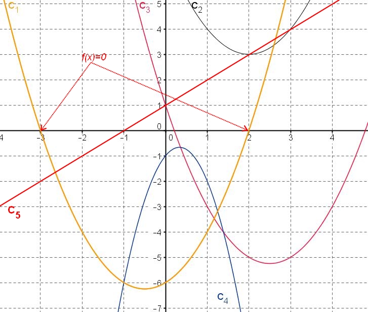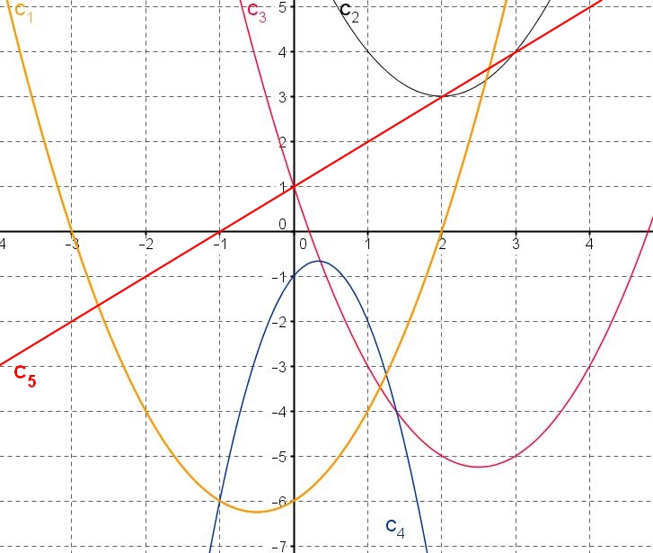 $f(x)=x^2-5x+1$, $g(x)=-3x^2+2x-1$, $h(x)=(x-2)^2+3$, $i(x)=(x-2)(x+3)$ et $j(x)x+1$