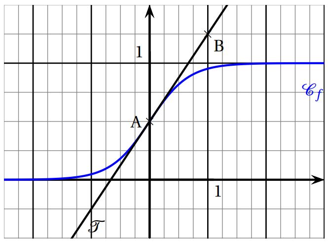 Partie C : Tangente et convexité- Déterminer par le calcul une équation de la tangente $\mathcal{T}$ à la courbe $\mathcal{C}_f$ au point d'abscisse $0$.