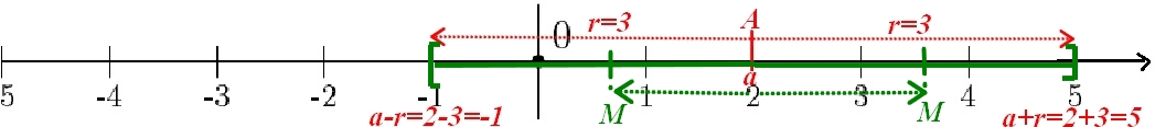 Si on pose $A$ d'abscisse $a$ et $M$ d'abscisse $x$ alors $AM=|x-a|=r$ avec $r > 0$.